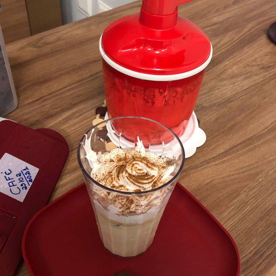 No Quick Shake, coloque o leite, 2 a 3 cubo do gelo do café, duas bolas do sorvete de creme, bata até misturar bem, sirva no copo Prisma Tupperware, com cobertura de Chantilly.