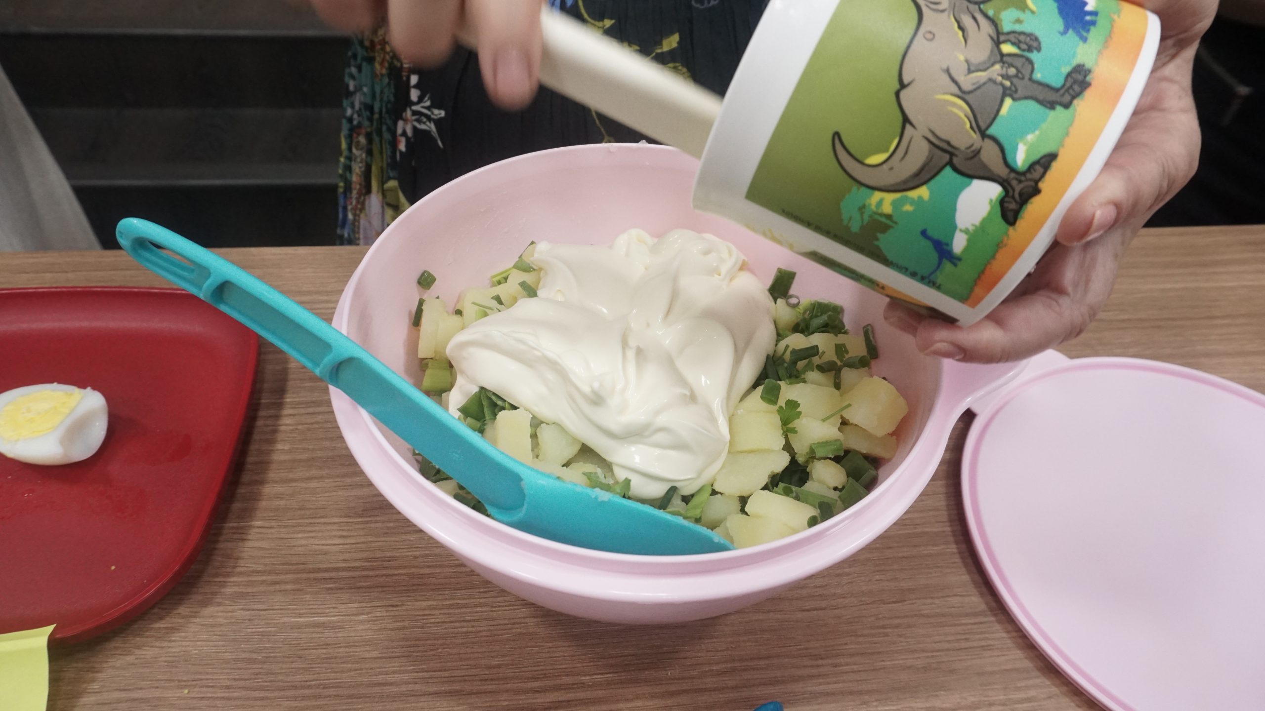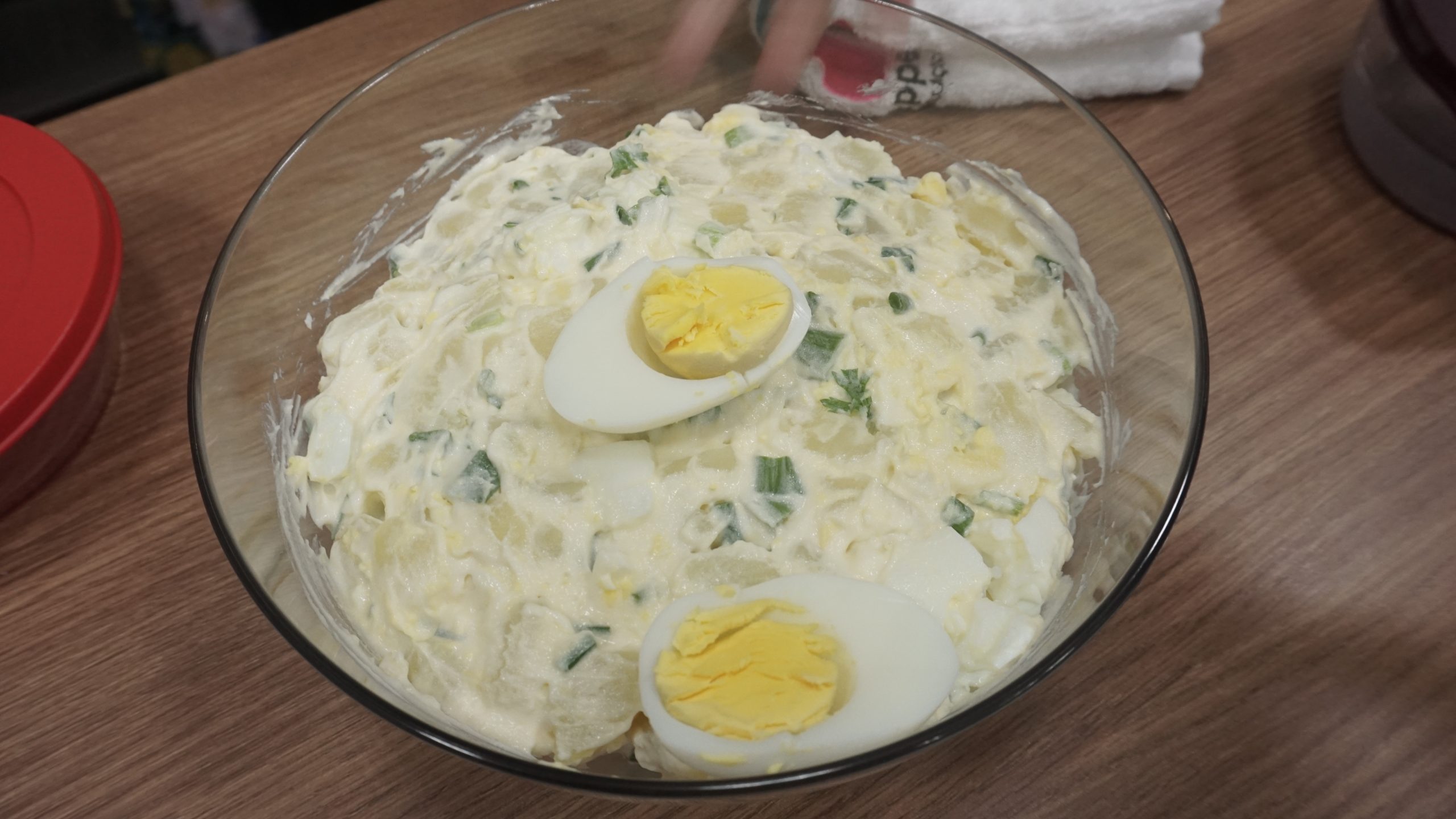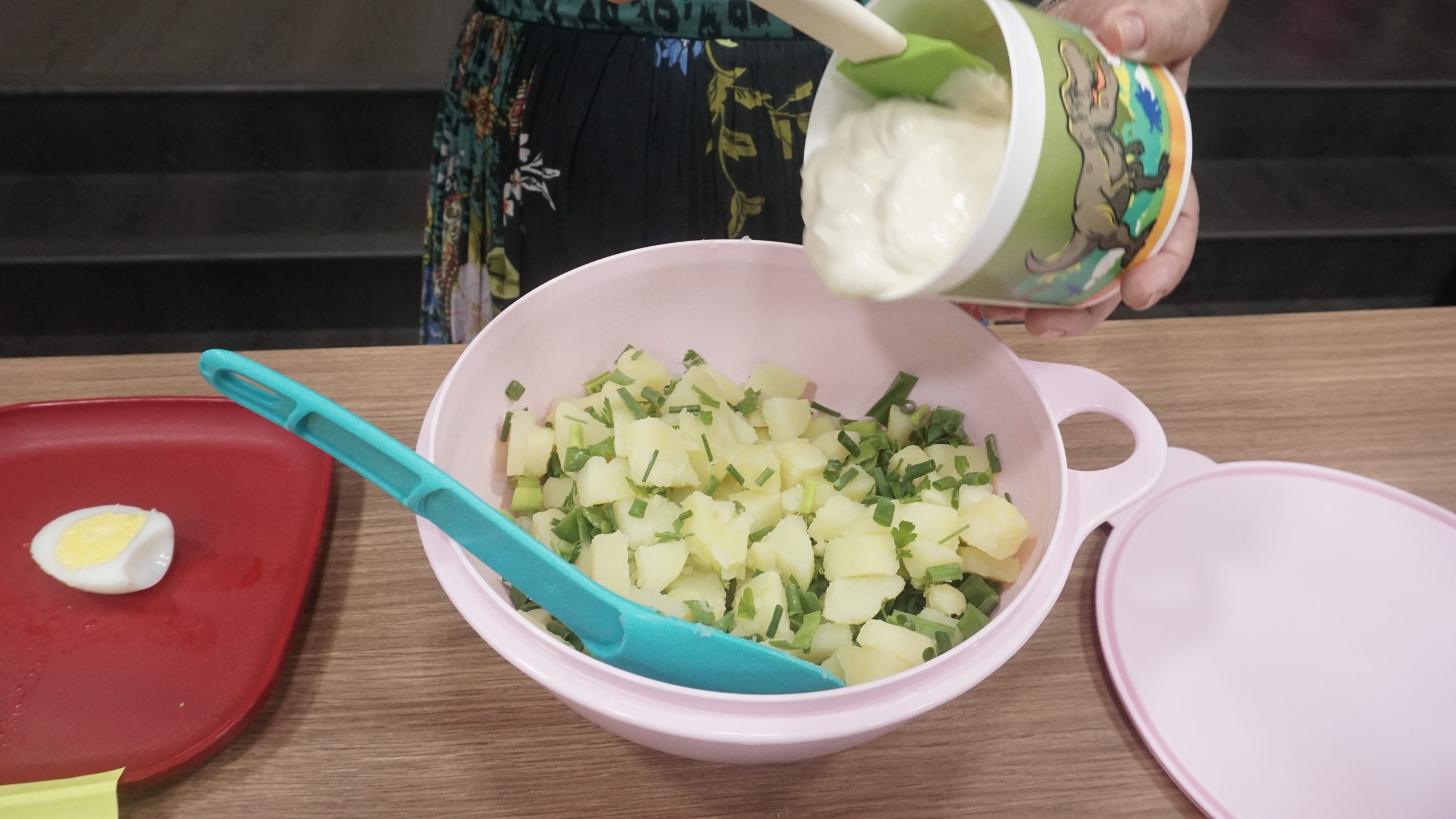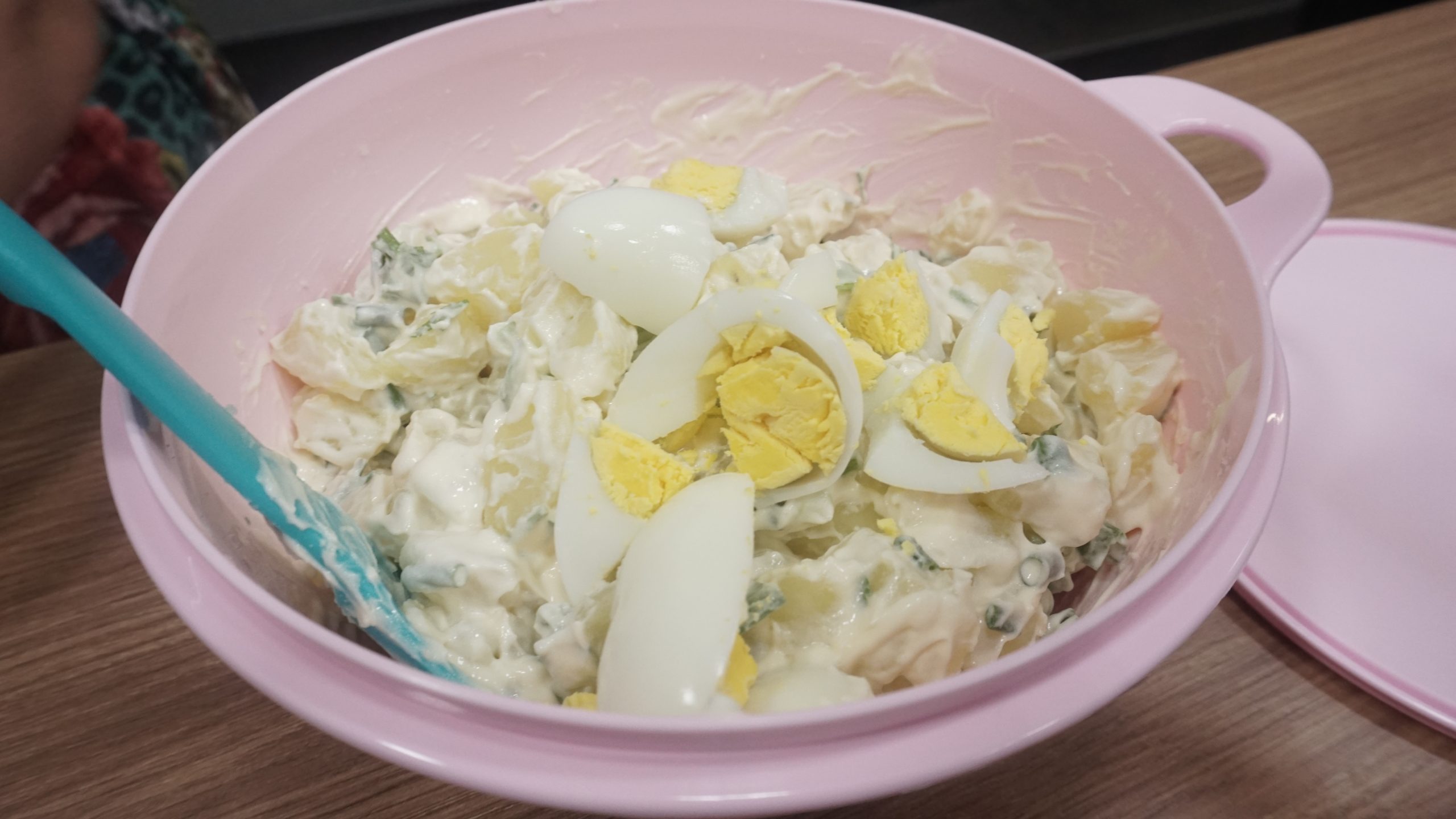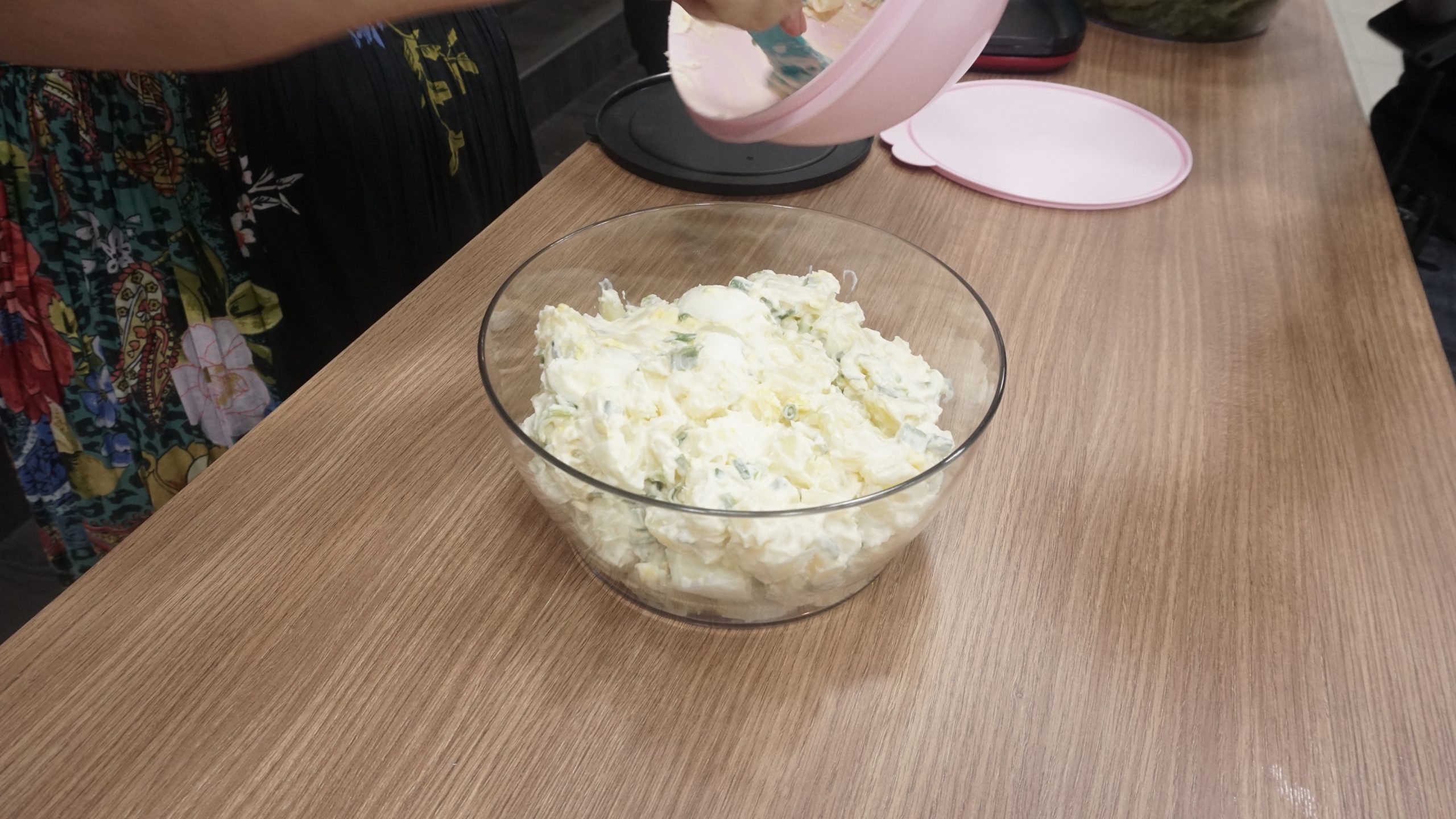 - Na Tigela Clear misture a maionese e os ovos cozidos, salpique a cebolinha e o cheiro verde.