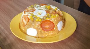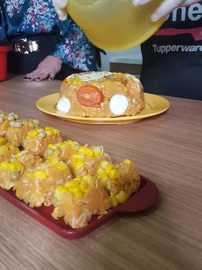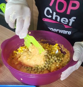 Modo de preparo: 1. Cozinhe o peito de frango na água com 1 colher de medida Tupperware 15 ml de azeite, reserve a água do cozimento; 2. Desfie o frango no Turbo Chef; 3. Na Cristalwave de 3L, coloque a água reservada do cozimento do frango (1 litro), o frango desfiado, o molho de tomate, o alho, a cebola, o sal, pimenta do reino, e coloque no micro-ondas por 06 minutos (abra o micro-ondas a cada 02 minutos); 4. Acrescente as latas de milho e ervilha, 1 ovo picado (Turbo Chef) e 1 tomate picado (Turbo Chef) e coloque mais 1 minuto no microondas; 5. Acrescente a farinha de milho, misture bem e coloque por mais 2 minutos no microondas 6. Acrescente a salsinha picada (Turbo Chef) 7. Na outra Cristalwave de 3 litros coloque rodelas de ovos cozidos, tomate em rodelas (fatiados no Super Chef Junior) no fundo e nas laterais e acrescente toda a massa pronta do cuscuz pressionando com uma pá bateira. 8. Aguarde 15 minutos e desenforme