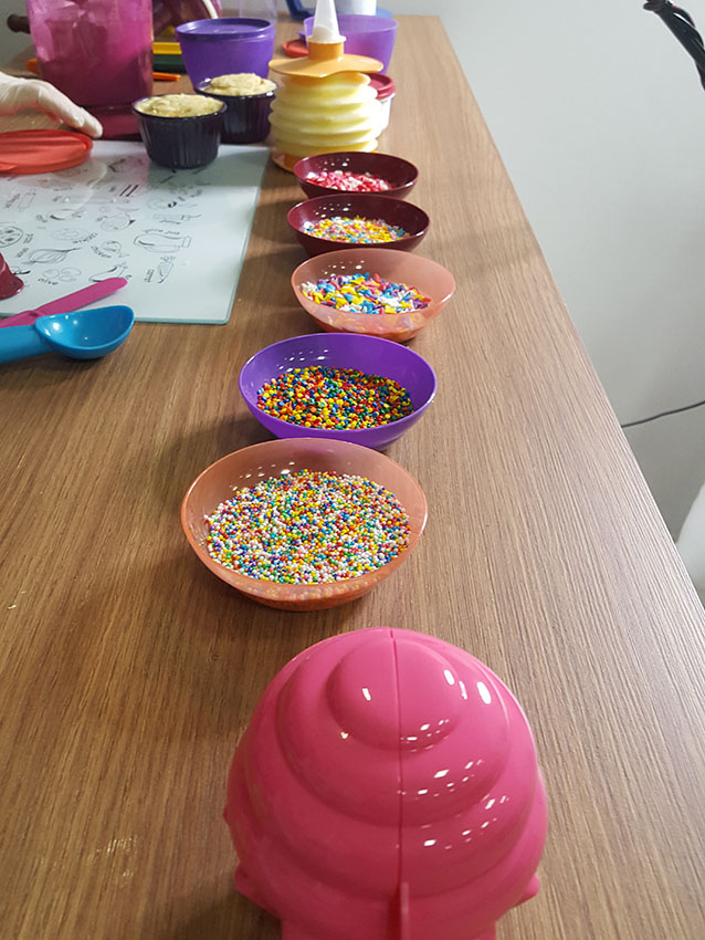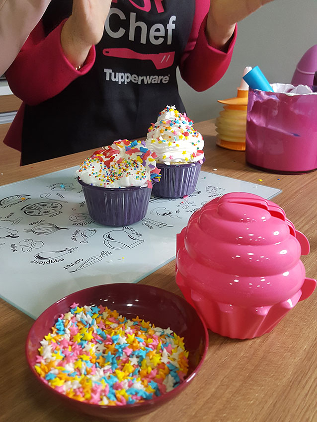 Modo de preparo: Massa: Prepare a massa pronta para bolo conforme as intruções na embalagem. Coloque a massa na Micro Cook Cupcake, um pouco menos da metade da forminha. E leve ao micro-ondas por 01 minuto. Aguarde esfriar e desenforme. Recheio: Para adicionar o recheio de sua preferência, com a ajuda de uma faca, faça um buraco no meio do cupcake, retire a massa, e com um bico de confeitar ou uma pá para patê Tupperware complete o buraquinho com o recheio. Você pode fechar o buraco com a mesma massa que retirou ou em seguida colocar a cobertura sem tampar. Cobertura: Bata no Speedy Chef o Creme de leite freco ou a mistura pronta para Chantilly gelado até adquirir uma consistência firme. Coloque no Bico de confeitar Tupperware e decore a gosto. Você pode jogar por cima granulado, ou confeito a gosto.